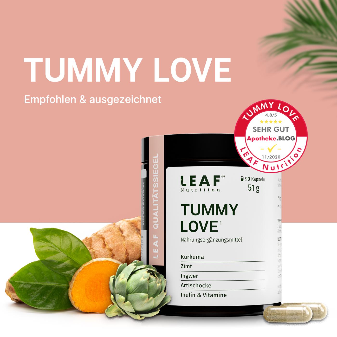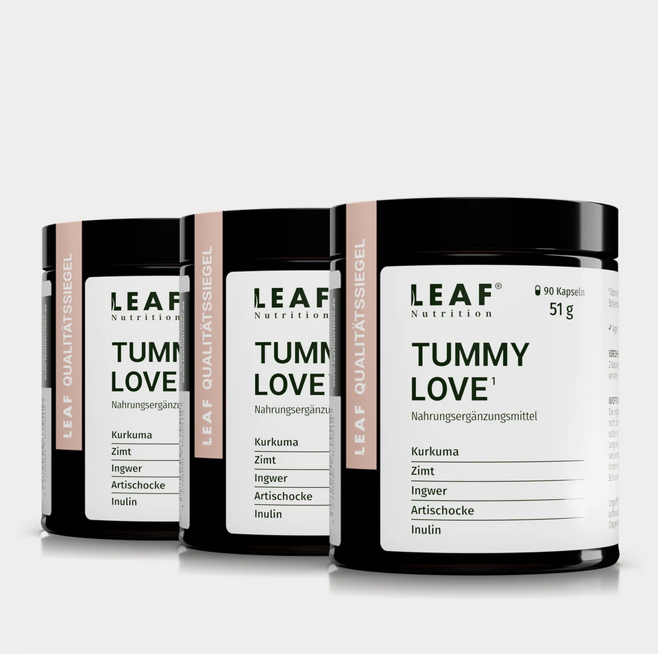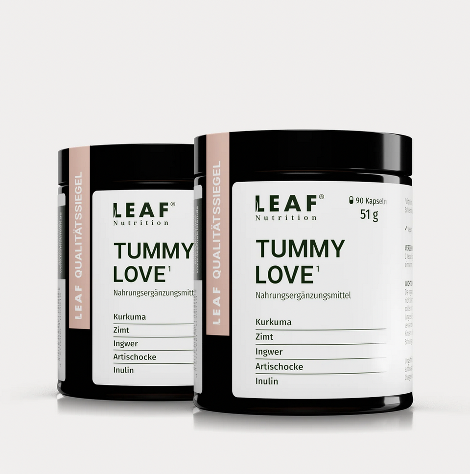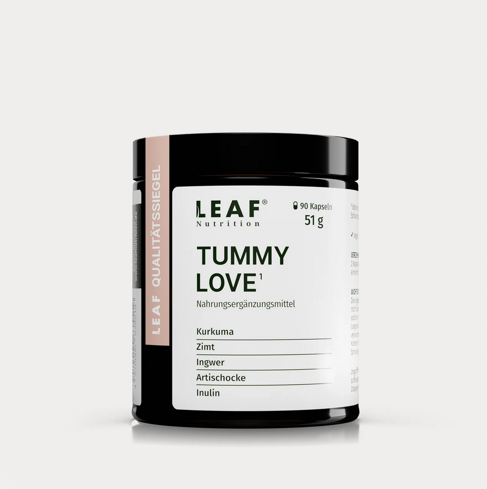 Die kraftvolle Zusammensetzung von TUMMY LOVE enthält Inulin, Vitamin B3 & D-Biotin und sorgt somit für mehr Wohlbefinden und bringt deine Körpermitte so auf sanfte Weise zurück ins Gleichgewicht. Vitamin B3 und D-Biotin tragen dabei zur Erhaltung normaler Schleimhäute bei (z.B. auch im Darm).